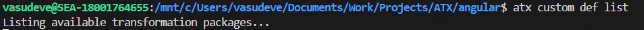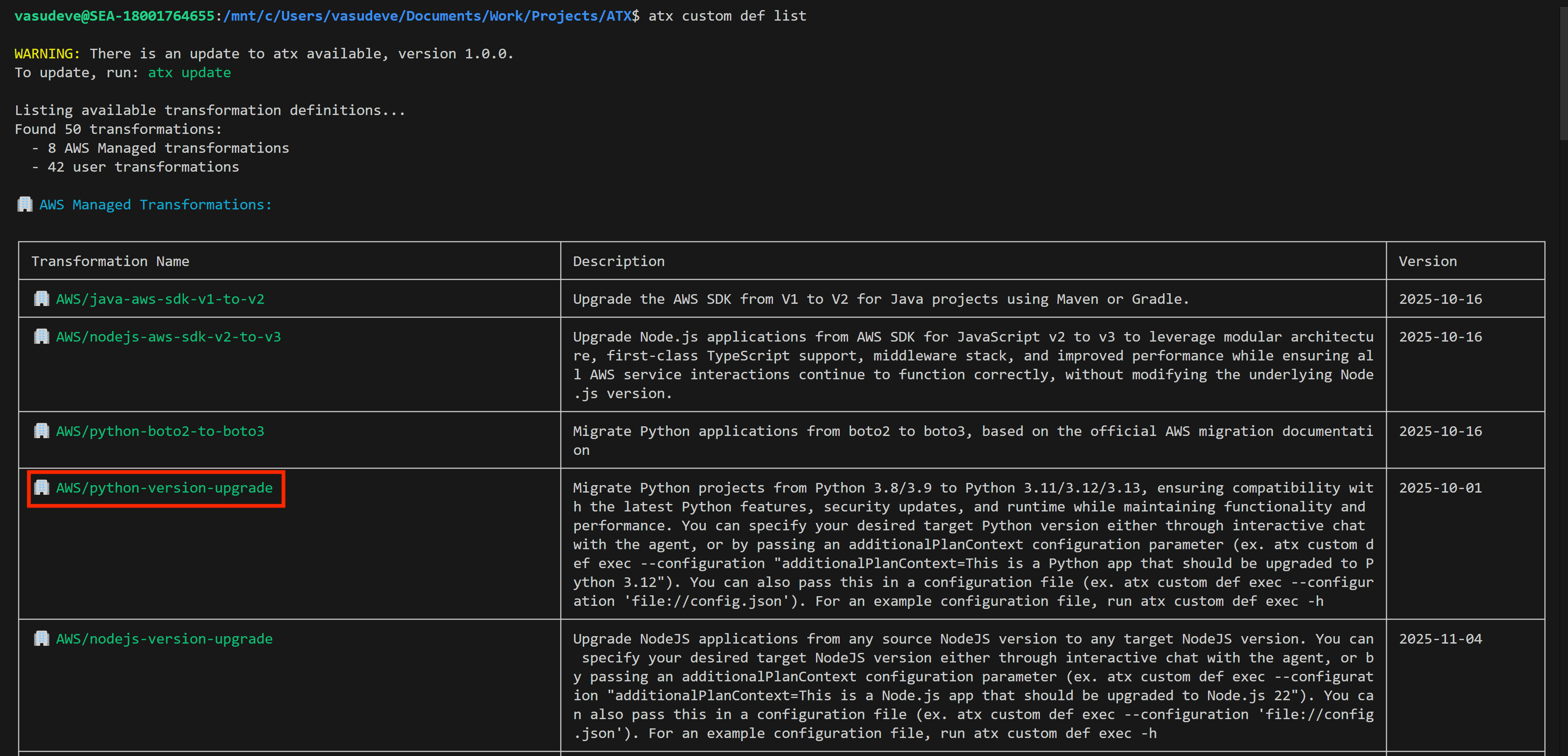 First, I use the command atx custom def list to explore the available transformation definitions. You can also access this functionality through a conversational interface by typing only atx instead of issuing the command directly, if you prefer.