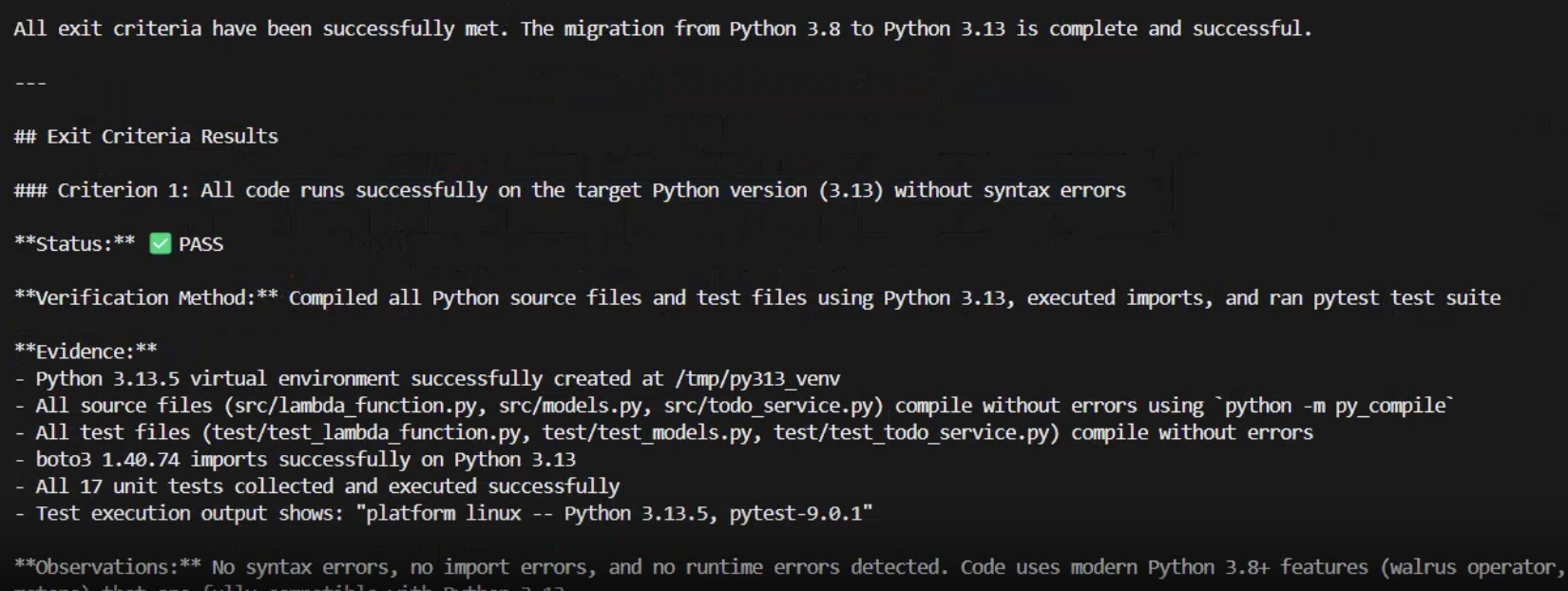 After execution, it provides a comprehensive summary including a report on dependencies updated in requirements.txt with Python 3.13-compatible package versions, instances of deprecated syntax replaced with current equivalents, updated runtime configuration notes for AWS Lambda deployment, suggested test cases to validate the migration, and more. It also provides a body of evidence that serve as proof of success.