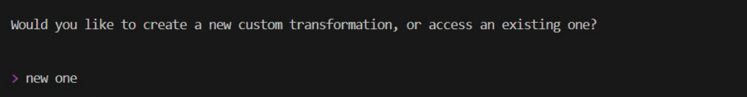 The first thing it asks me is if I want to use one of the existing transformations or create a new one. I choose to create a new one. Notice that from here on the whole conversation takes place using natural language, not commands. I typed new one but I could have typed I want to create a new one and it would’ve understood it exactly the same.