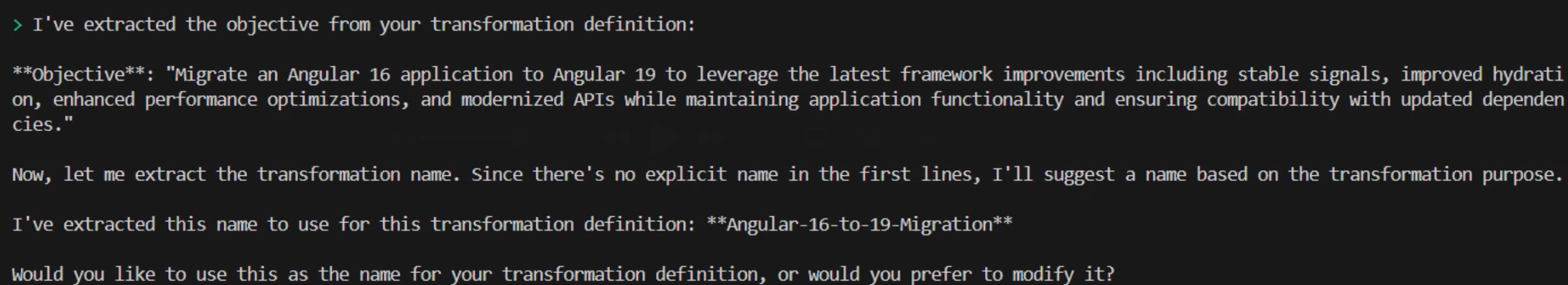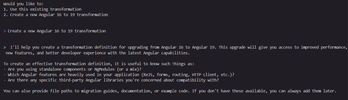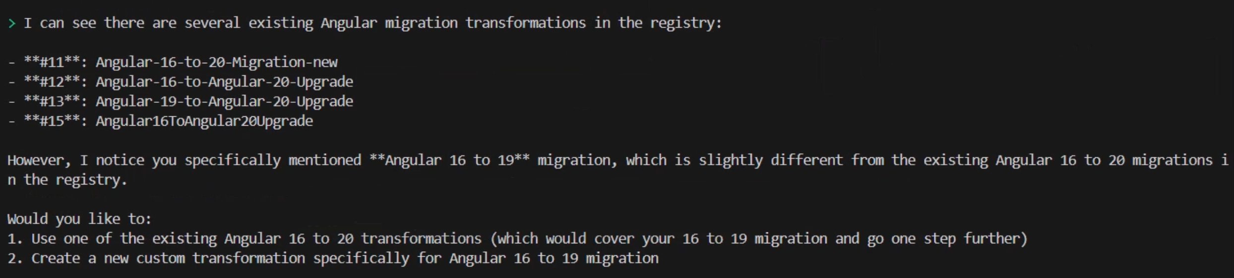 It then prompts me to provide more information about the kind of transformation I’d like to perform. For this demo, I’m going to migrate an Angular application, so I type angular 16 to 19 application migration which prompts the CLI to search for all transformations available for this type of migration. In my case, my team has already created and made available a few Angular migrations, so it shows me those. However, it warns me that none of them is an exact match to my specific request for migrating from Angular 16 to 19. It then asks if I’d like to select from one of the existing transformations listed or create a custom one.