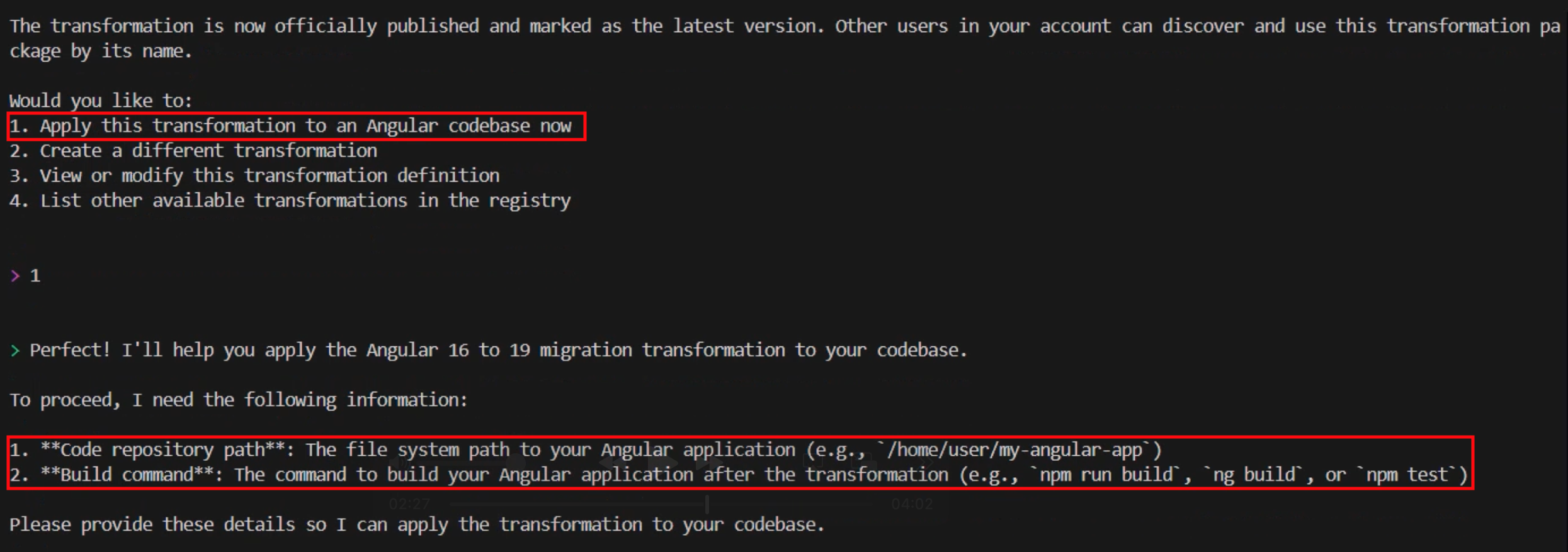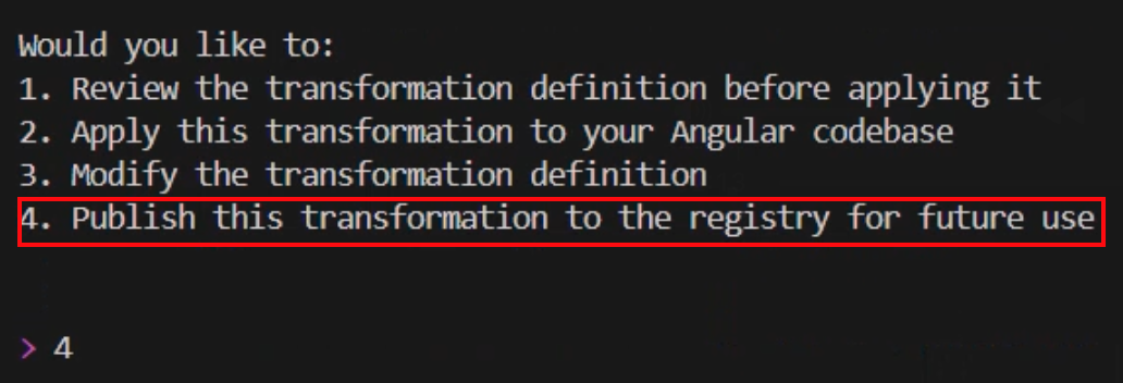 After the transformation definition is created, AWS Transform asks me about what I would like to do next. I can choose to review or modify the transformation definition and I can reiterate through this process as much as I need until I arrive at one that I’m satisfied with. I can also choose to already apply this transformation definition to an Angular codebase. However, first I want to make this transformation available to my team members as well as myself so we can all use it again in the future. So, I choose option 4 to publish this transformation to the registry.