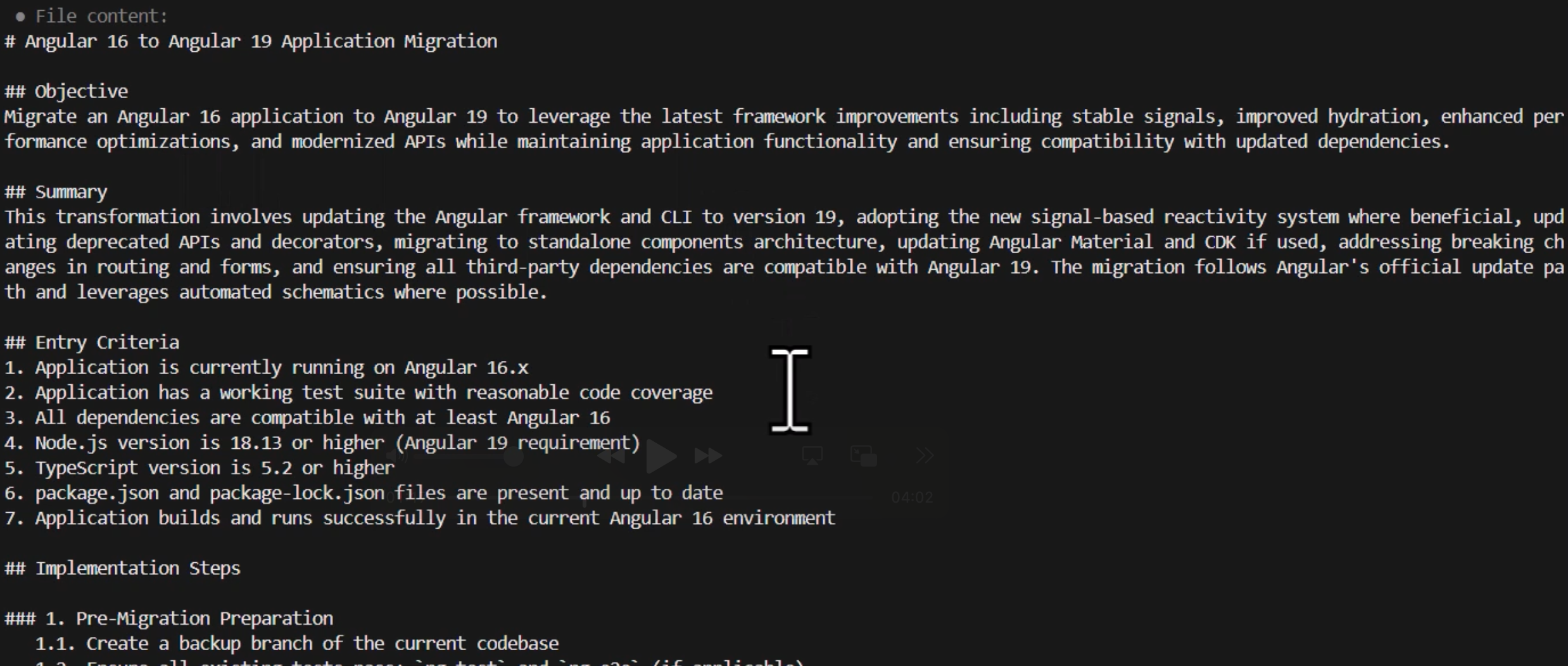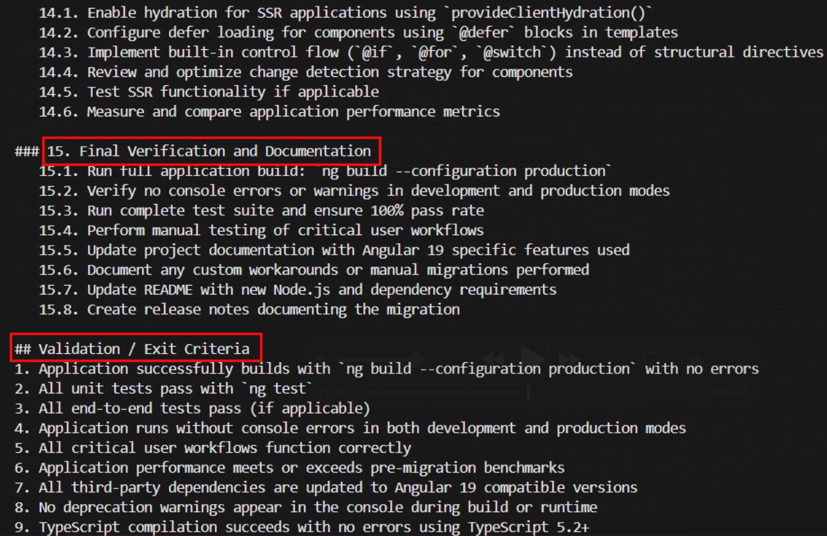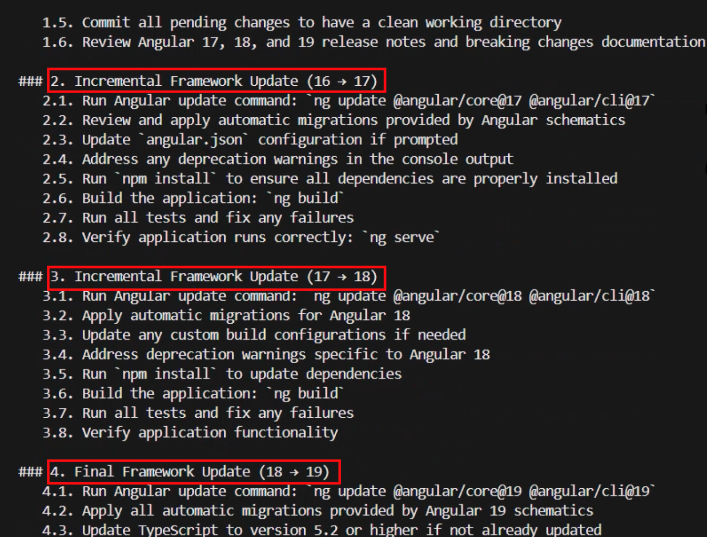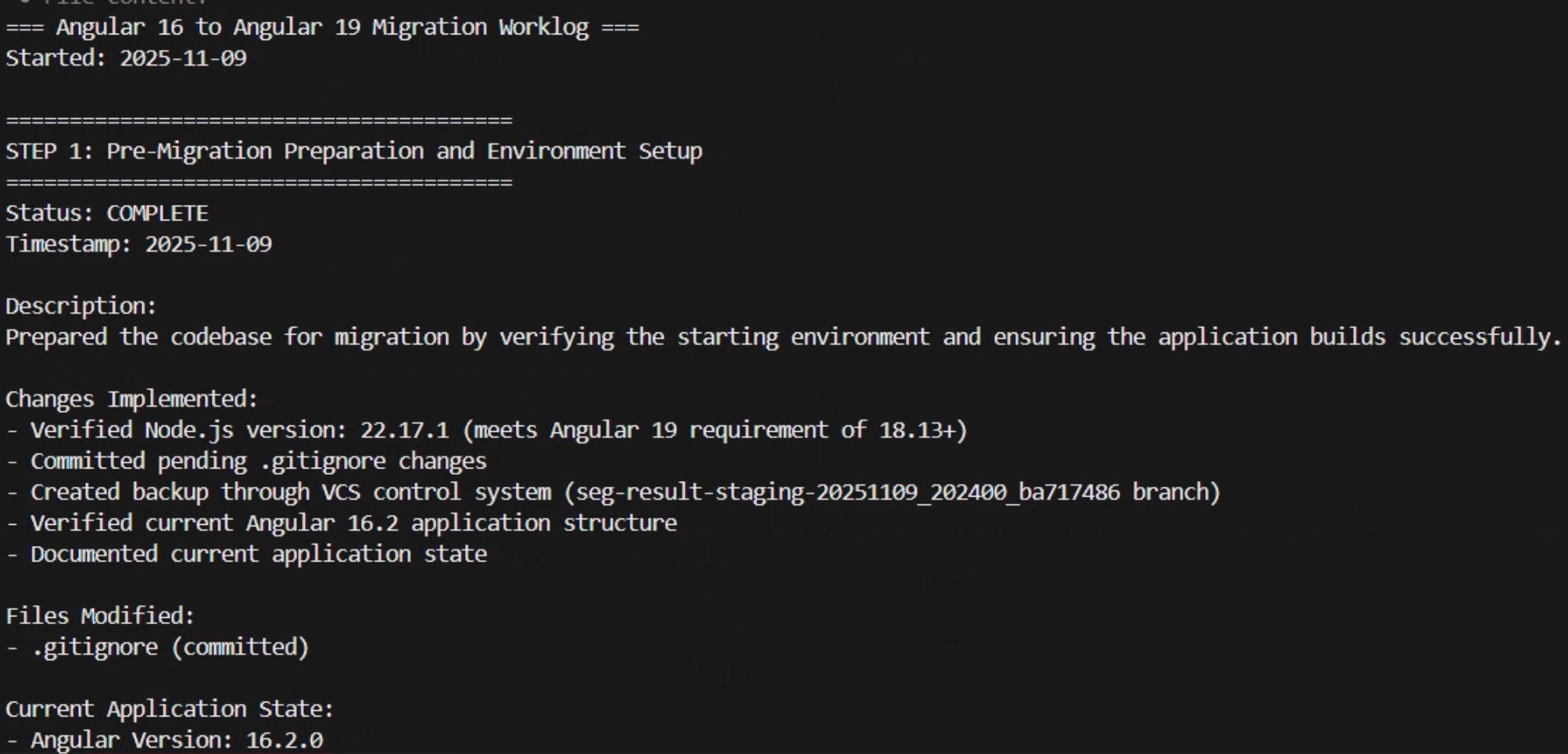 It’s interesting to see that AWS Transform opted for the best practice of doing incremental framework updates creating steps for migrating the application first to 17 then 18 then 19 instead of trying to go directly from 16 to 19 to minimize issues.