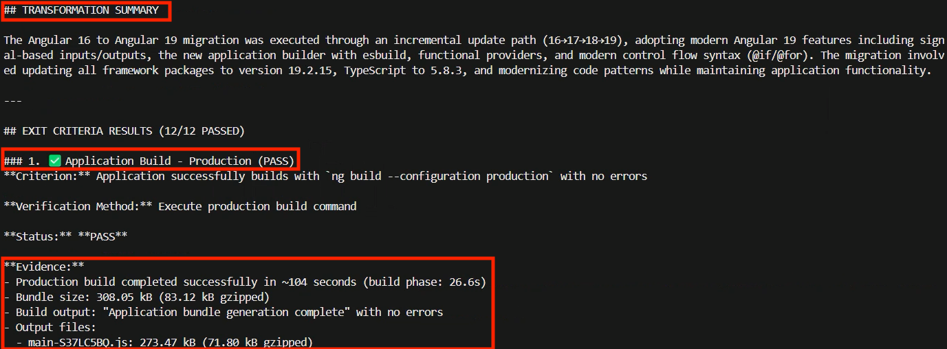 The time it takes will vary depending on the complexity of the application. In my case, it took a few minutes to complete. After it has finished, it provides me with a transformation summary and the status of each one of the exit criteria that were included in the final verification phase of the plan alongside all the evidence to support the reported status. For example, the Application Build – Production criteria was listed as passed and some of the evidence provided included the incremental Git commits, the time that it took to complete the production build, the bundle size, the build output message, and the details about all the output files created.