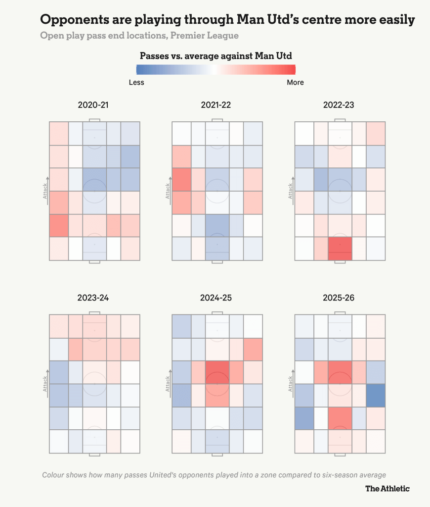 The map below shows the percentage of passes played into different zones against United compared to their six-season Premier League average, with their exposed central area standing out since Amorim took charge.