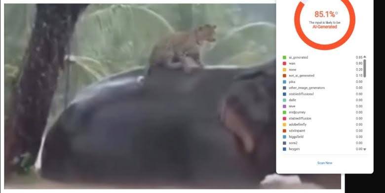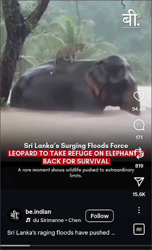 Our investigation confirms that the viral footage showing a leopard treading on an elephant’s back during floods in Sri Lanka is fabricated. The scene is not a real event; it is a digital creation generated by artificial intelligence.