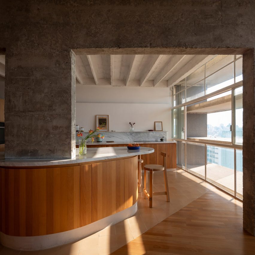 Located inside the Oscar Niemeyer-designed Copan building in São Paulo, this apartment was redesigned by Estúdio BRA to highlight its architectural features.