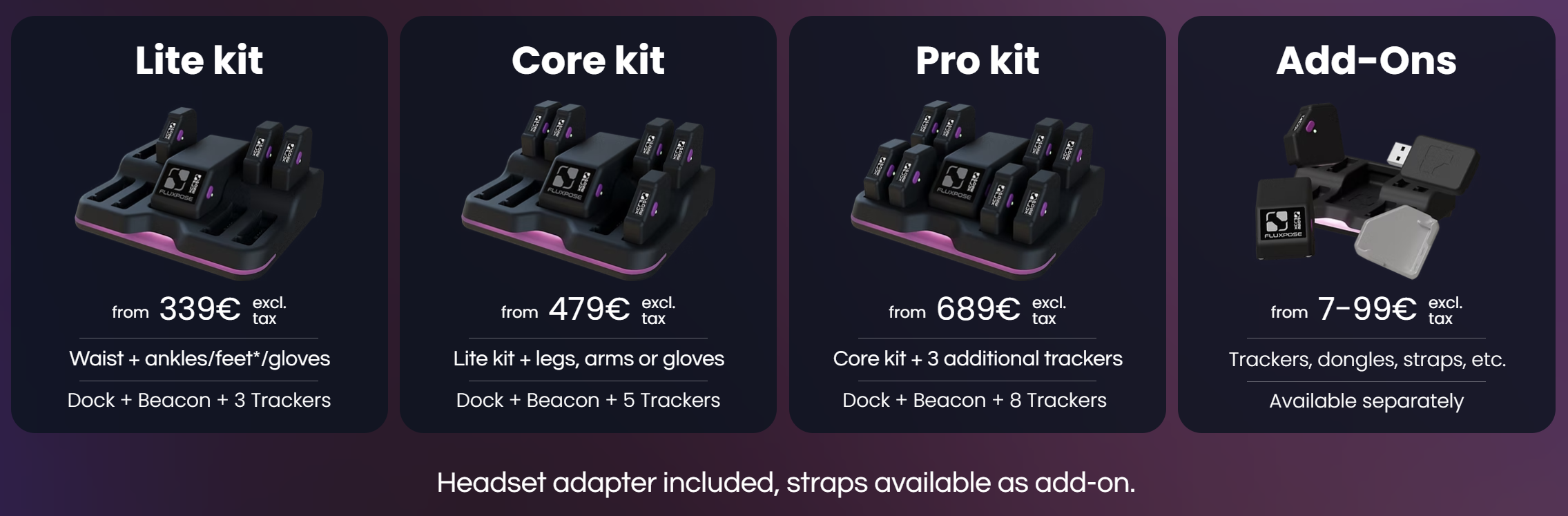 On Kickstarter, you can pledge for three kits: Lite, Core, and Pro. Lite is priced at €339 before tax and comes with 3 trackers, Core at €479 with 5 trackers, and Pro at €689 with 8 trackers. Additional addons like straps are available separately.