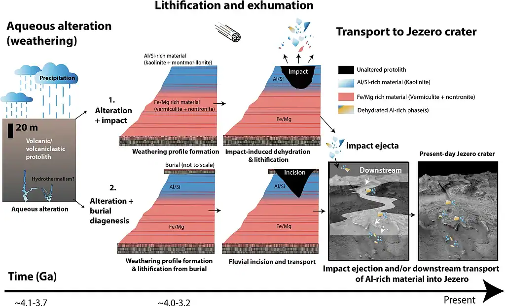 Proposed sequence of events for Al-rich float rocks at Jezero Crater. Credit: Communications Earth & Environment, 2025.