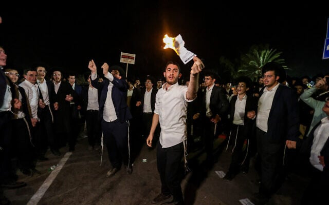 Ultra-Orthodox demonstrators burn enlistment orders at a demonstration outside the Beit Lid military prison, August 14, 2025. (Tal Gal/Flash90)