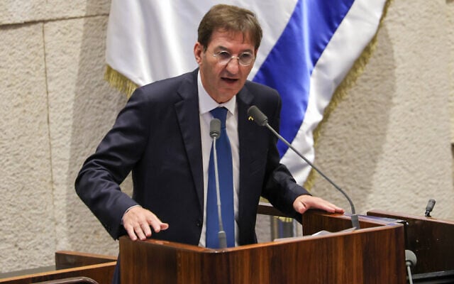 Defense and Foreign Affairs Committee head Boaz Bismuth speaks in the Knesset plenum on August 13, 2025. (Dani Shem Tov/Knesset spokesperson)