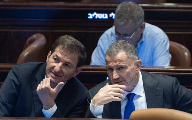 Likud MK Boaz Bismuth (left) speaks to fellow party MK Yuli Edelstein in the Knesset on July 23, 2025. (Yonatan Sindel/Flash90)