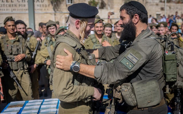 Soldiers from the Hasmonean Brigade take part in a ceremony at the Western Wall in Jerusalem’s Old City on August 6, 2025. (Chaim Goldberg/Flash90)