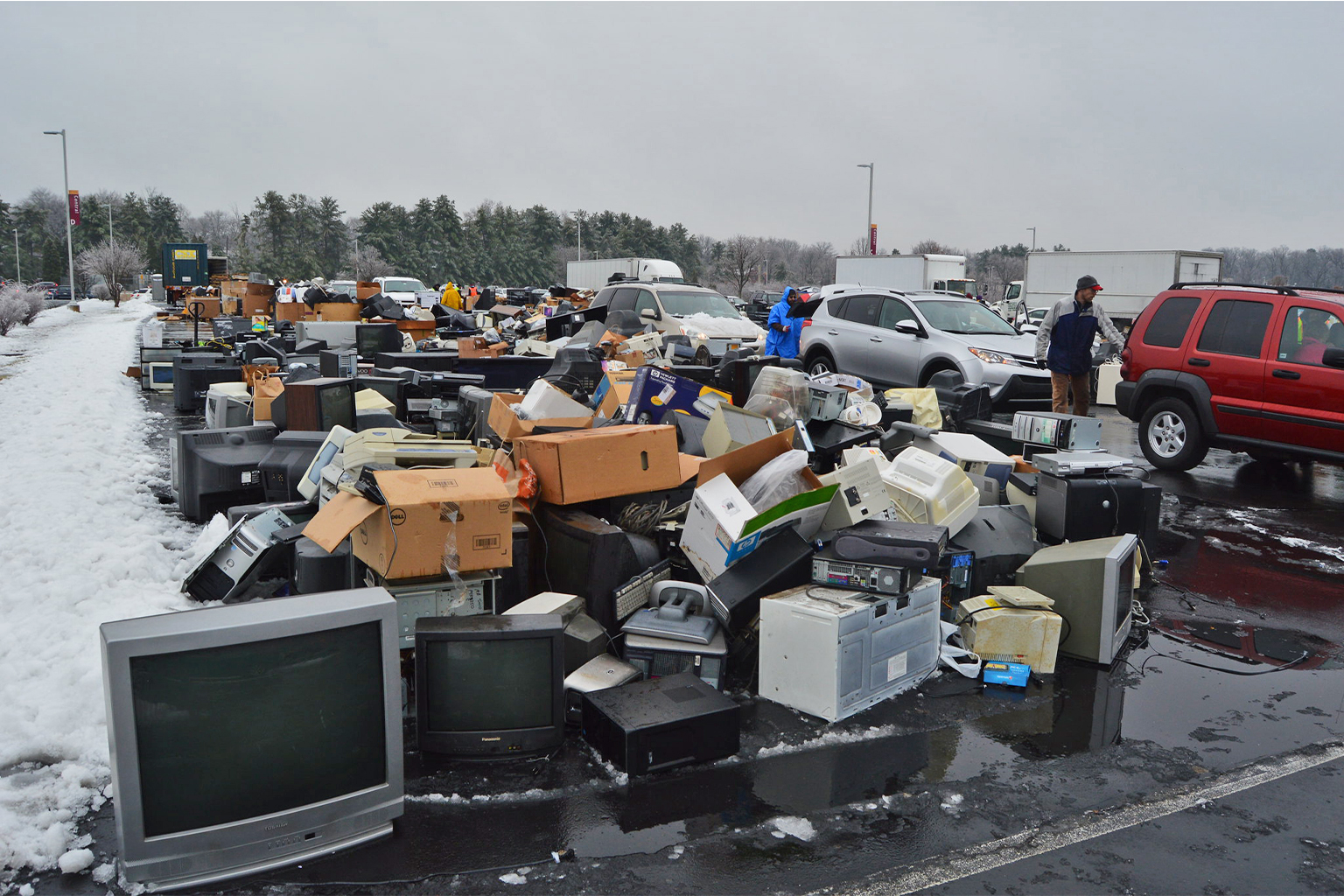 E-waste is the fastest growing domestic waste stream on Earth and the most toxic. Some communities offer e-waste drop-off for recycling as seen here, but how much of this collected e-waste is ever properly recycled is largely unknown, with much shipped from the Global North to Global South which lacks safe processing facilities. Also, invisible e-waste often isn’t recognized by consumers as being potentially toxic and requiring proper recycling so it is disposed of with other household trash. Image by Montgomery County Planning Commission via Flickr (CC BY-SA 2.0).