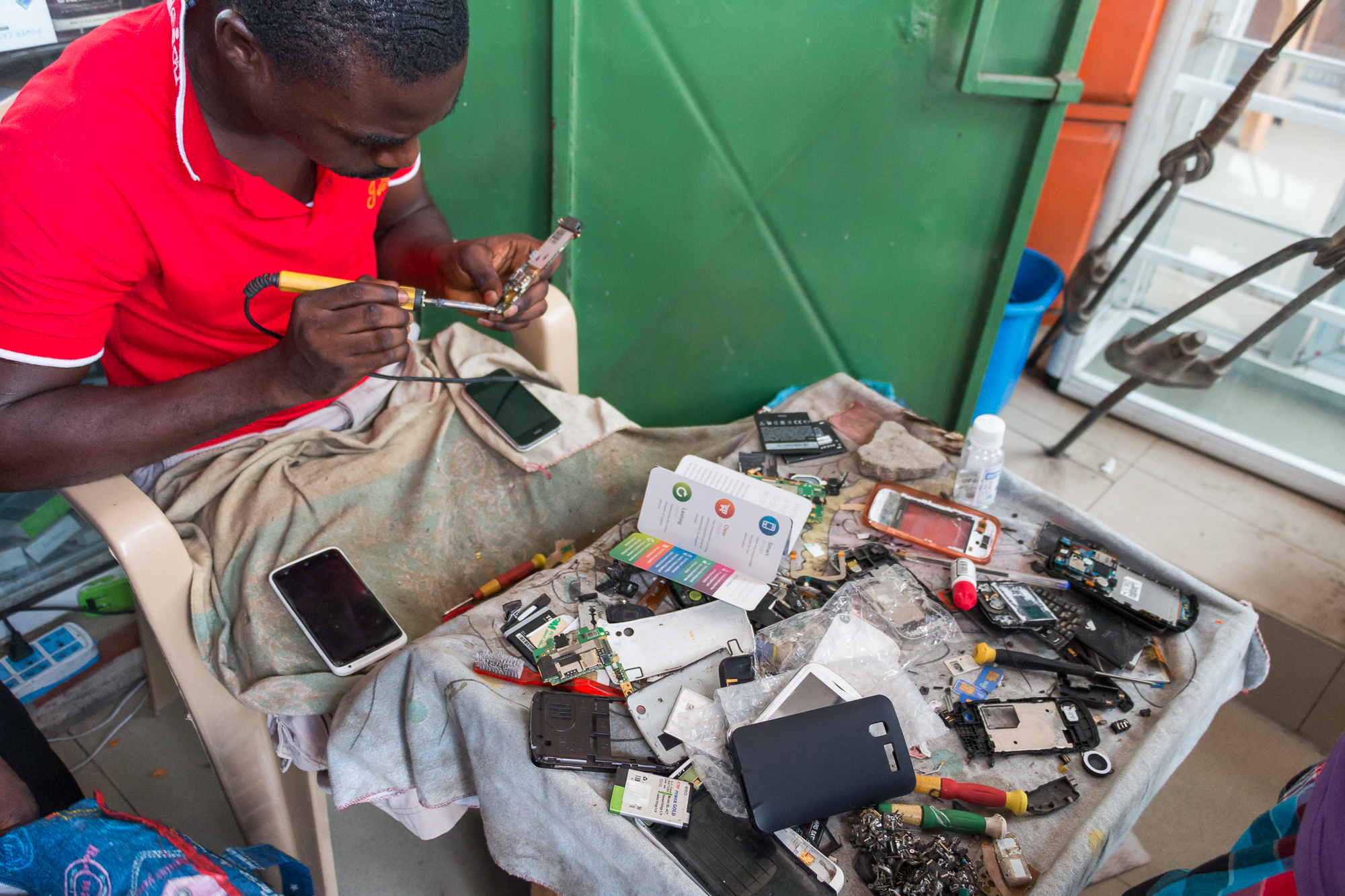Street side electronic repairs in Accra, Ghana. Only a tiny percentage of all e-waste is currently recovered for reuse. Image courtesy of Fairphone via Flickr (CC BY-NC 2.0).