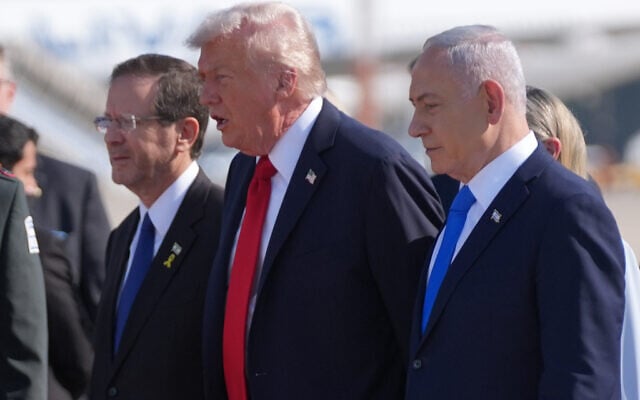 President Donald Trump (center) walks with President Isaac Herzog (left), and Prime Minister Benjamin Netanyahu at Ben Gurion Airport, October 13, 2025, near Tel Aviv. (AP/Evan Vucci)
