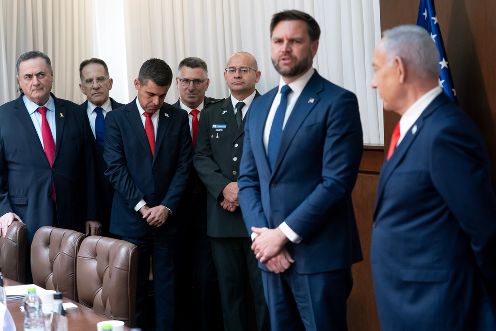 (From left) Israel’s Minister of Defense Israel Katz, Chief of Staff Tzachi Braverman, spokesperson Ziv Agmon, Foreign Minister Gideon Saar and Major General Roman Gofman listen as US Vice-President JD Vance meets with Israel’s Prime Minister Benjamin Netanyahu at his office in Jerusalem, on Oct 22, 2025. (PHOTO / AFP)