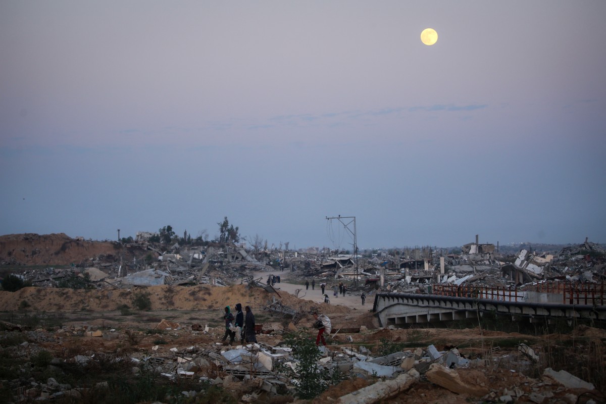 People walk amid the rubble of destroyed buildings as the Cold Moon, the last supermoon of the year, rises over the Nuseirat camp for displaced Palestinians in the central Gaza Strip on Dec 4, 2025. (PHOTO / AFP)