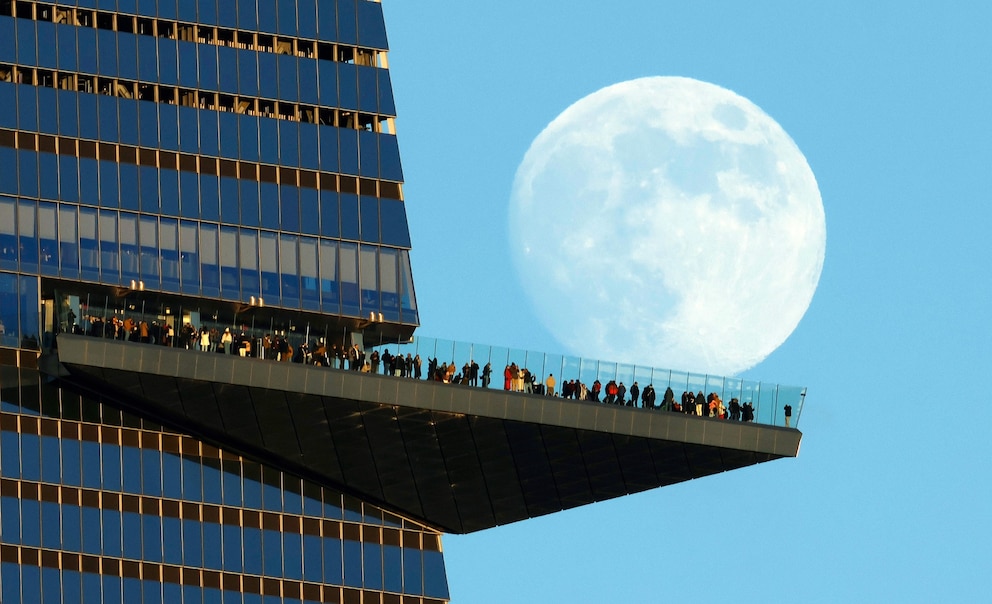In Dec. 13, 2024, file photo, a Cold Moon rises behind the EdgeNYC outdoor observation deck at Hudson Yards as the sun sets in New York.