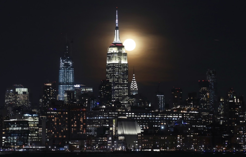In this Dec. 12, 2019, file photo, the full Cold Moon rises behind the Empire State Building and Chrysler Building in New York.