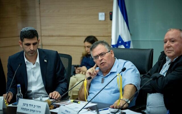Likud lawmakers (L-R) Shlomo Karhi, David Bitan and David Amsalem attend a committee meeting at the Knesset on November 20, 2023. (Yonatan Sindel/Flash90)