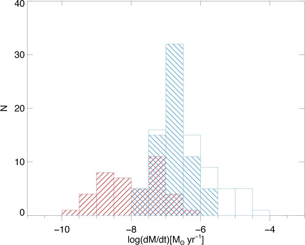 *This figure from the research shows the accretion rates for Intermediate Mass T-Tauri Stars in red, and Herbig stars in blue. “The median stellar accretion rate of Herbig stars is 1 order of magnitude higher than the median stellar accretion rate of IMTTSs,” the authors write. Image Credit: Brittain et al. 2025. AnJ*