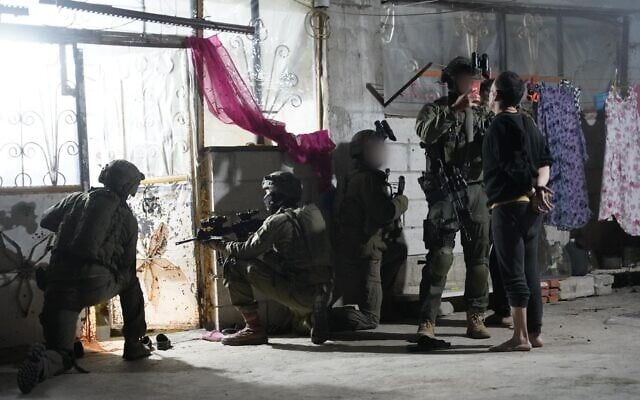 Troops of the 55th Reserve Paratroopers Brigade detain a suspect in the southern Syrian village of Beit Jinn, early November 28, 2025. (Israel Defense Forces)