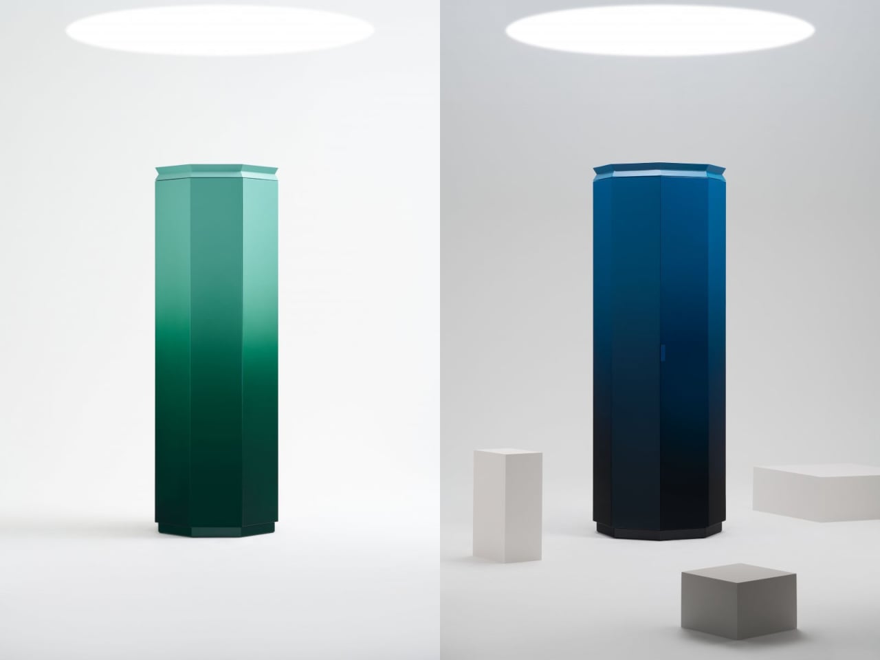 When closed, Ottagono reads like a sculptural floor lamp rather than a cabinet full of kettlebells. The exterior is finished in gradient tones, deep blue fading lighter toward the top or emerald green transitioning upward, with clean facets and minimal seams. At its summit, an integrated uplight washes the ceiling in soft ambient glow. In a living room or suite, it sits quietly under that halo, looking more like art than utility, which seems to be exactly what Foscari and Cassina intended.