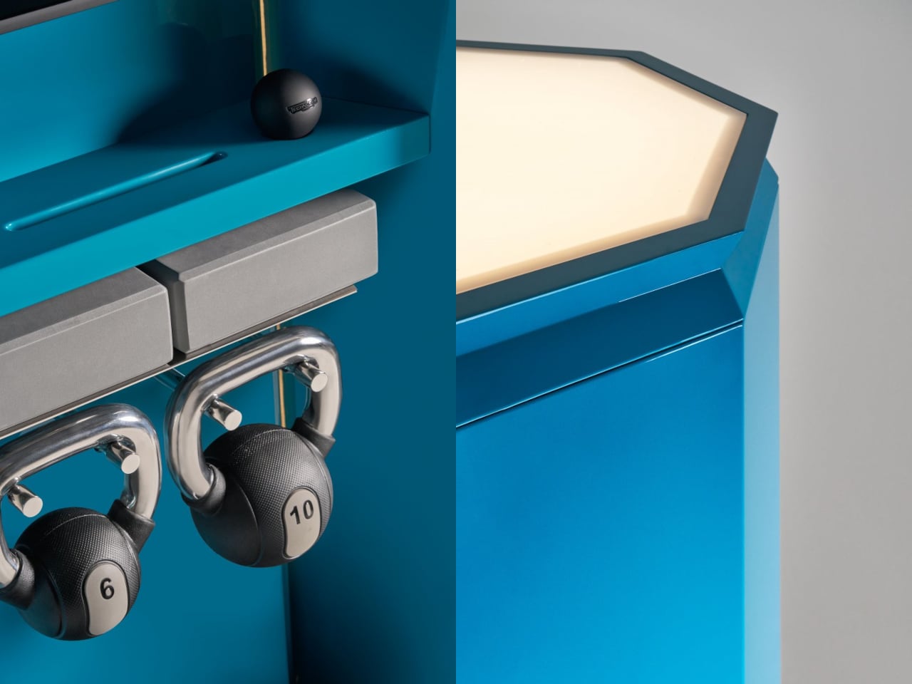 Open the doors, and the mood shifts completely. The interior glows in bright turquoise, with a vertical screen at eye level streaming Technogym workouts and a mirror on one door for checking form. Adjustable dumbbells nestle into octagonal cradles at the base, kettlebells hang on polished hooks, resistance bands drape from pegs, and a foam roller stands vertically alongside mobility balls. Foscari calls it “opening a room within a room,” which feels accurate because the inside genuinely reads like a micro gym carved from a single piece of furniture.