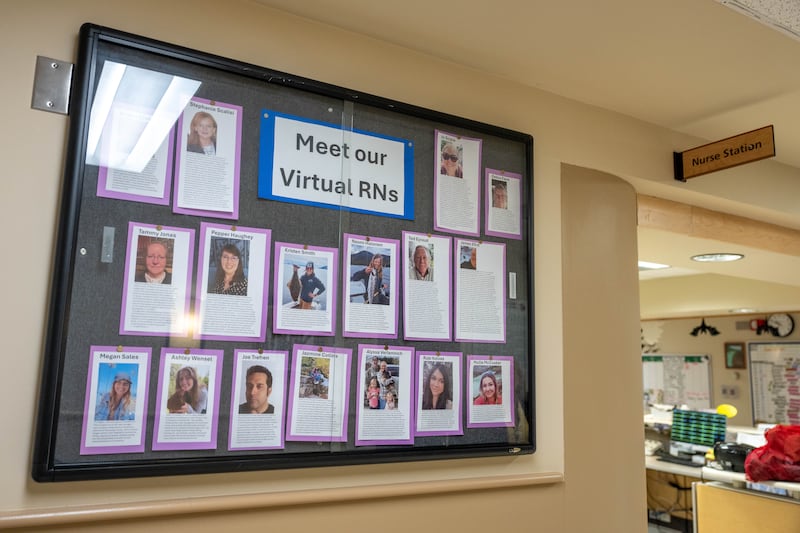 A board next to a nurse station in a medical-surgical unit at Providence Alaska Medical Center in Anchorage introduces virtual RNs in 2024. (Loren Holmes / ADN archive)