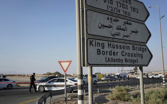 Israeli police stand guard near the site of a shooting attack where two soldiers were killed at the Allenby Bridge Crossing between the West Bank and Jordan, Sept. 18, 2025. (AP Photo/Mahmoud Illean)