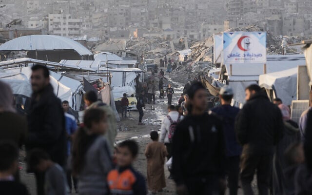 Displaced Palestinians walk through a muddy pathway between tents set up amid destroyed buildings in Jabaliya, in the northern Gaza Strip, December 7, 2025. (AP Photo/Jehad Alshrafi)