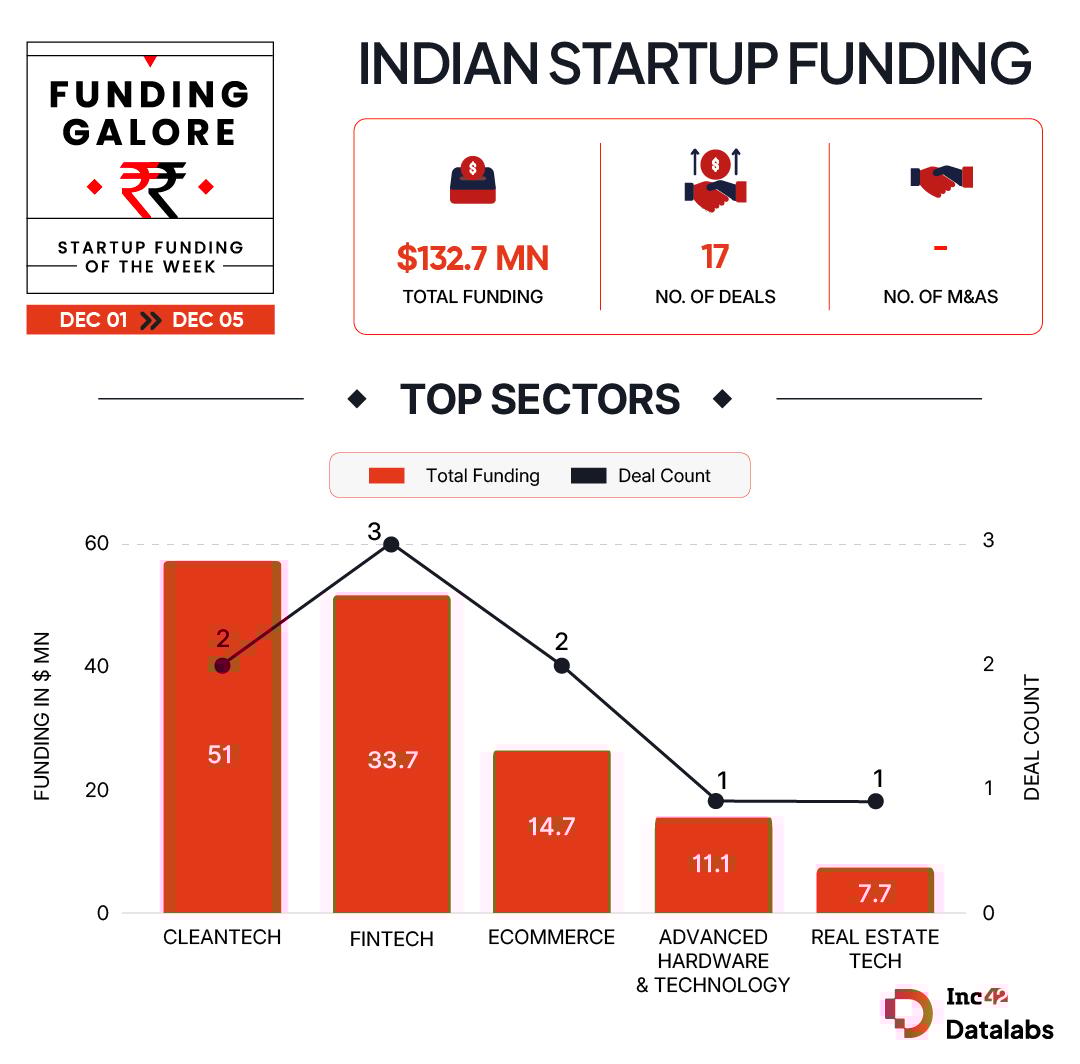 Between December 1 and 5, 18 startups raised $132.7 Mn, marking a 32% decline from $195.2 Mn raised by 24 startups in the preceding week