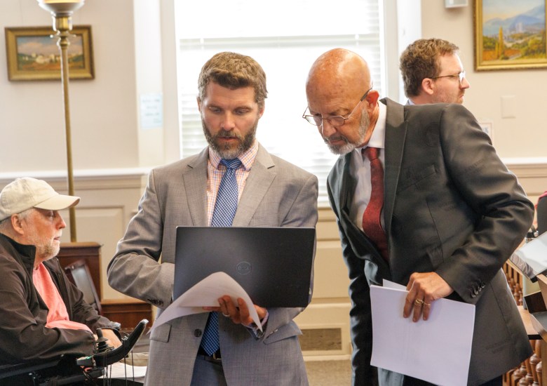 Santa Cruz city planning director Lee Butler (left) discusses plans with Mayor Fred Keeley. Credit: Kevin Painchaud / Lookout Santa Cruz