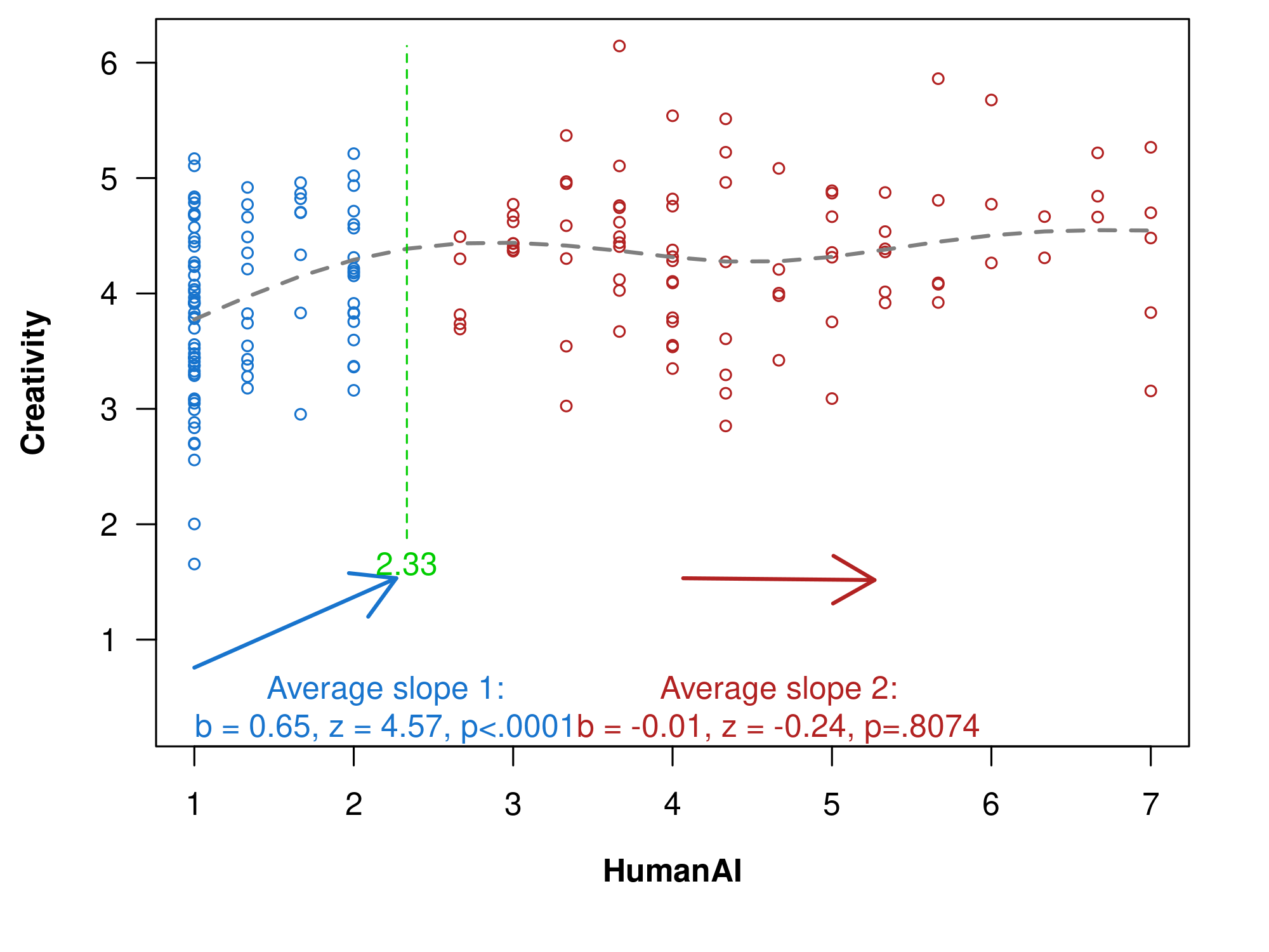 Figure 6 in the paper, and my airbrushed-in confidence band, assume that the true association between AI Involvement and Creativity is perfectly captured by a quadratic function. That is, it estimates a quadratic regression and takes the resulting estimates at face value.