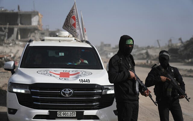 Hamas gunmen accompanied by members of the International Committee of the Red Cross (ICRC) head to the Zeitoun neighborhood of Gaza City to search for the remains of deceased hostages, December 8, 2025. (Jehad Alshrafi/AP)