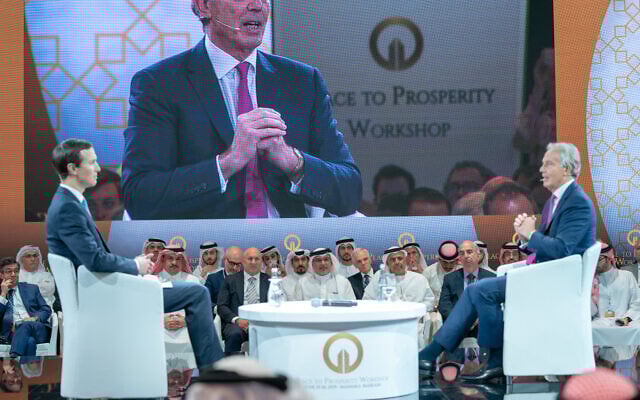 A handout picture released by Bahrain’s official news agency (BNA) shows Jared Kushner and former British prime minister Tony Blair at the closing session of the US-sponsored Middle East economic conference “Peace to Prosperity,” in Manama on June 26, 2019. (Bahrain News Agency)