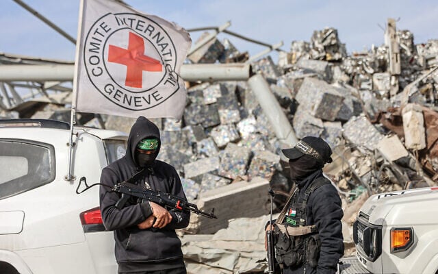Palestinian Hamas gunmen patrol as Egyptian workers, accompanied by members of the International Committee of the Red Cross (ICRC), search for the remains of the last Israeli hostage, Ran Gvili, in the Zeitoun neighborhood of Gaza City on December 8, 2025. (Omar AL-QATTAA / AFP)