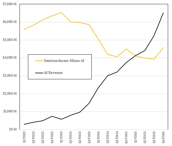 In the quarter, AI XPU sales were modest, around $765 million in our model, but up 2.2X from a year ago. Most of the AI sales came from AI networking, which we think hit $5.74 billion thanks in large part to the 102.4 Tb/sec Tomahawk 6 rollout but also helped by the Jericho 4 rollout, too, we think. This is a factor of 3.1X sequential boost in revenue. Add it up, and AI drove $6.51 billion in revenues, up 74 percent year on year.