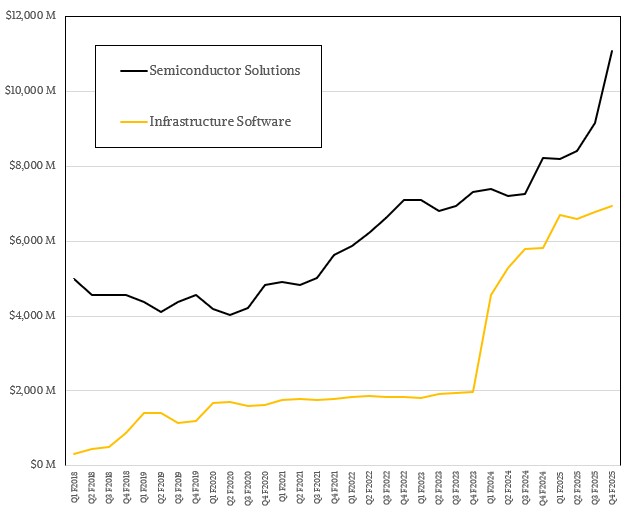 In the final quarter of fiscal 2025, the Semiconductor Solutions group at Broadcom had $11.07 billion in sales, up 34.5 percent, with operating income of $6.53 billion, up 41.7 percent. For the year, the chip side of the Broadcom house had $36.86 billion in revenues, up 22.5 percent, with operating income of just a hair over $23 billion, up 37.6 percent and representing 62.5 percent of revenues. This is still a very healthy business given that margin-diluting XPU business.