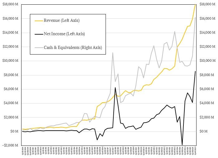 Broadcom ended the quarter with $16.18 billion in cash and $65.14 billion in debts, the latter trending downward ever so slowly and the former growing fast.