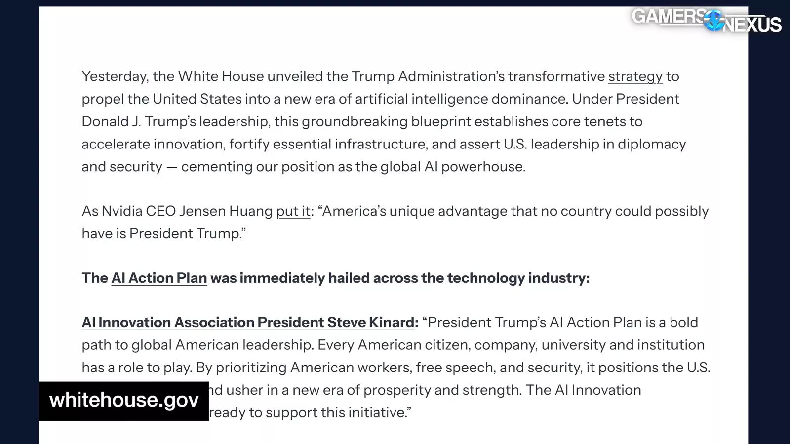 That same day, whitehouse.gov posted an article titled, “Wide Acclaim for President Trump’s Visionary AI Action Plan.” Near the top of the post, it highlighted a sycophantic quote from Huang, which read, “America’s unique advantage that no country could possibly have is President Trump.” And we could call that sycophantic if it was about any president.