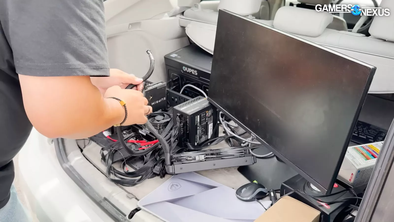 The Plug, as we call him, has an ATX test bench, motherboard, simple downdraft cooler, power supply, obviously a CPU, RAM, and an SSD, and gigantic battery in the trunk of his Prius. He also has at least one spare license plate in his trunk in addition to the one on the back of his car. We’re not sure why, but it’s better not to ask.