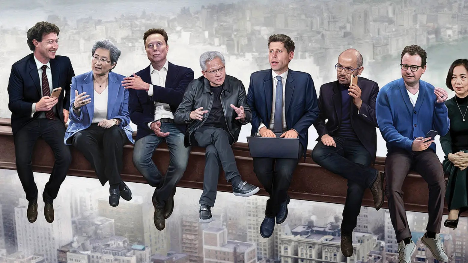 AI titans including Jensen Huang, Mark Zuckerberg, Elon Musk, Sam Altman, and Fei-Fei Li are depicted on Time’s ‘Person of the Year’ cover. Images: Peter Crowther, Jason Seiler / Time