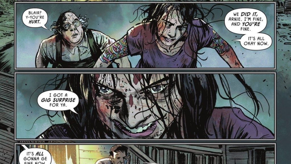 Unfortunately, it wasn’t actually Blair. When Batman went to check in on Wesker, he found Blair’s body. She’d been dead for at least a week, meaning that the person Wesker saw wasn’t Blair, but the newest evolution of his delusion. As Wesker raced through the streets, the hallucination of Blair spoke in Scarface’s signature accent, promising a “gig surprise” for the criminal, clearly returning to his roots.
