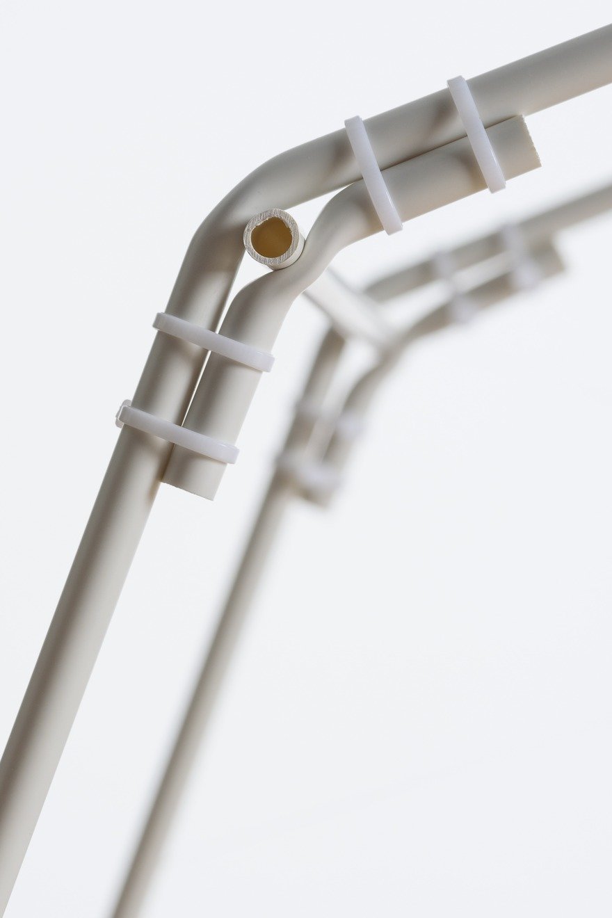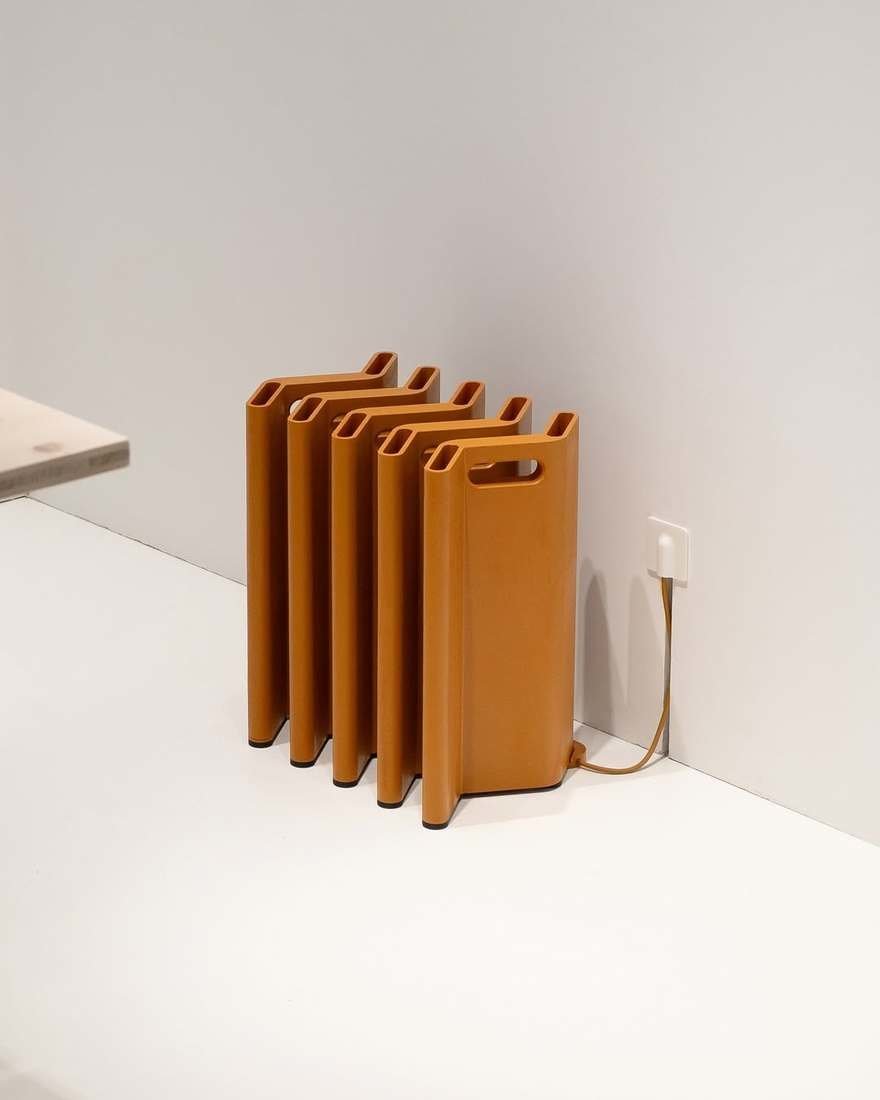 This re-thinking of central heating systems is by Moritz Walter, done while pursuing his Master of Industrial Design degree at the Weissensee Kunsthochschule Berlin. Rather than relying on central boilers and radiators, Moritz took a cue from space heaters—minus the metal fins. Instead, Walter did testing with electrically-heated fabric, then experimented with a variety of elegant forms to support the fabric.