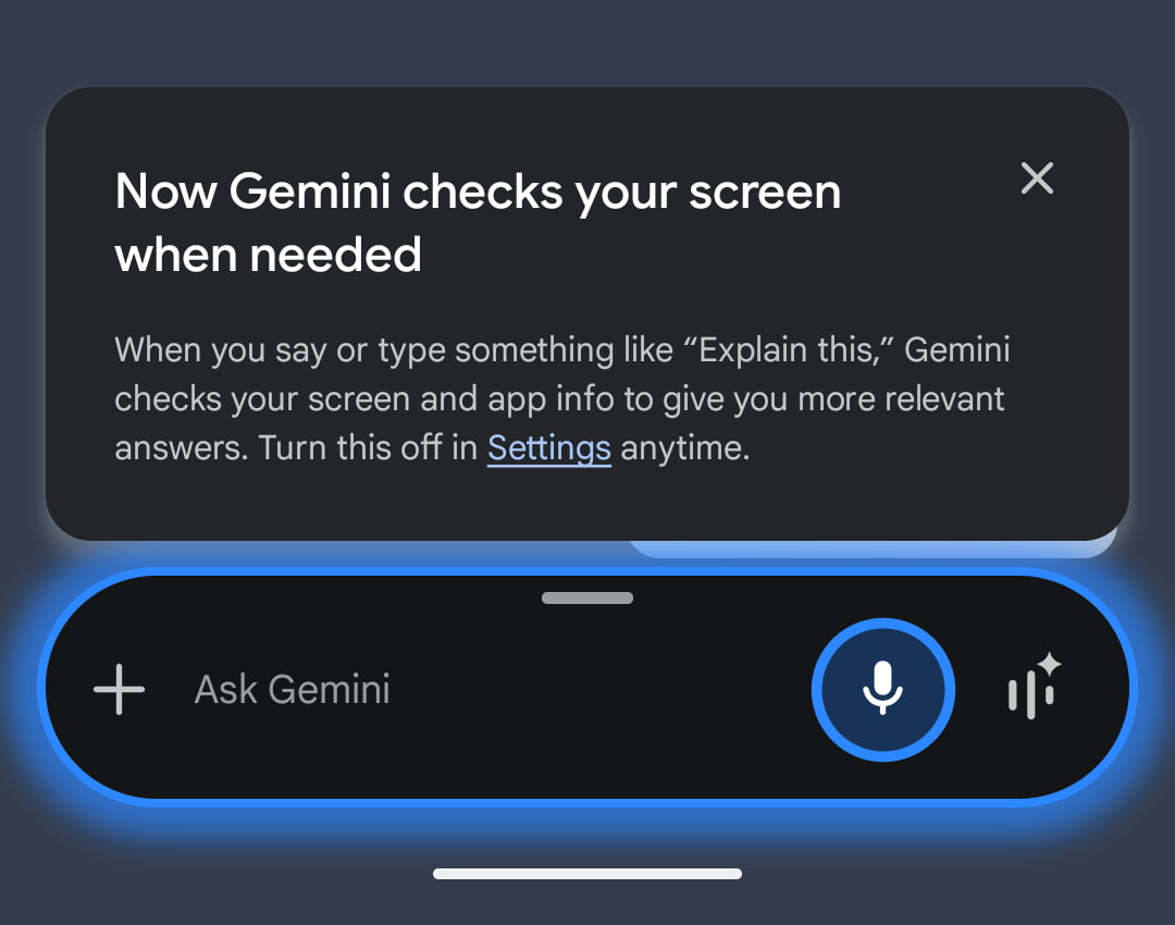 When you say or type something like “Explain this,” Gemini checks your screen and app info to give you more relevant answers. Turn this off in Settings anytime.