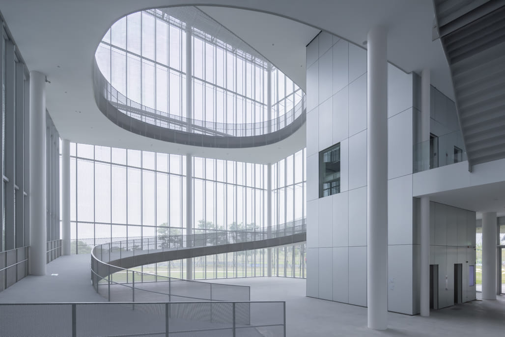 The structure comprises eight interconnected volumes of varying sizes. Its exterior features a dual layer-layer façade, including an inner layer of high-performance, low-emissivity glass and metal cladding and an outer layer of aluminium expanded metal mesh. This white veil gives the building a sense of lightness and transparency.