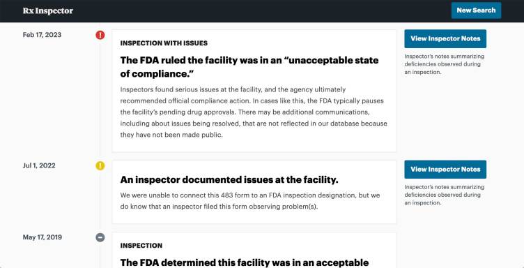 If the factory has been inspected by the FDA, we’ll show you the inspection reports and any subsequent warning letters. We didn’t have access to every inspection report, so you may only see summary information that includes the dates of the inspections and any findings.