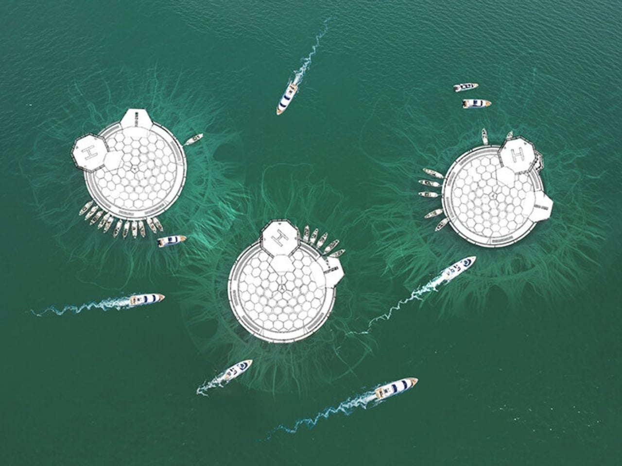 The structure itself is stunning in a practical way. Picture a circular floating platform with a central dome and perimeter walkway that organizes movement across the space. It’s designed to support research facilities, recreational areas, and even habitation. Freshwater gets produced through rainwater harvesting combined with solar and wave-powered desalination, meaning the whole thing functions as a self-sufficient ecosystem. No need to pipe in resources from mainland infrastructure.