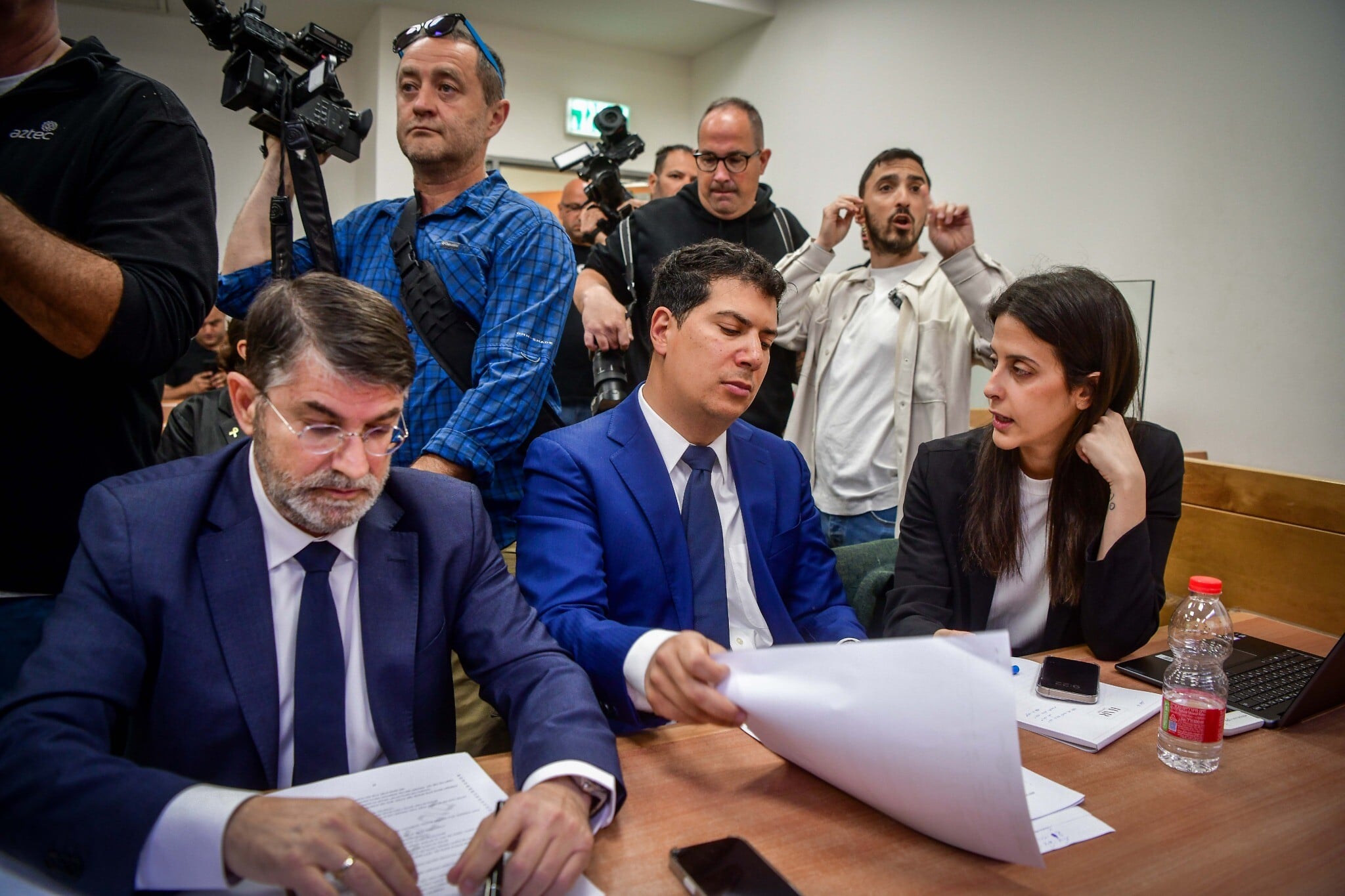 Eli Feldstein’s attorney Oded Savoray (left), Jonatan Urich’s attorney Amit Hadad (center) and other attorneys attend a court hearing at which police asked to extend the remand of Prime Minister Benjamin Netanyahu’s aides Urich and Feldstein amid the ongoing Qatargate investigation, at the Rishon LeZion Magistrate’s Court, April 3, 2025. (Avshalom Sassoni/Flash90)
